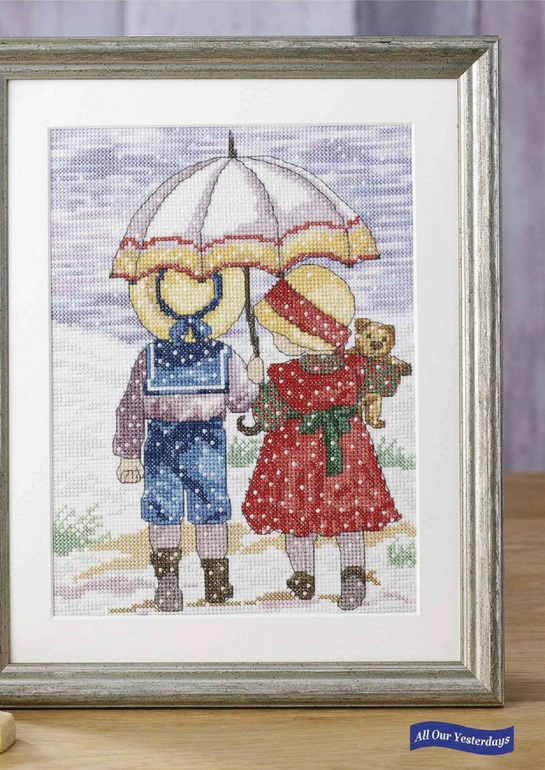 Классные) Я так ждала поцелуя в Вышиваем крестом, где девочка с коньками.. склероз, как правильно называется дизайн. Но там под снегом, и я все хотела прикупить льна в горошек)) А тут не схалтуришь, полная отшивка фона плюс дождинки. Но милые, правда))