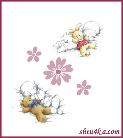 Я вышивала с Мишкой, для мальчика. Там всё понятно было. Тут как-то действительно запутано. Я бы вышивала из раздела 1 значок P черными нитками(цвет 310 в подборе), а значок 1 — розовыми (цвет 3706). Во втором разделе значок U судя по готовой работе, надо вышивать нитками 3708, причем там серый цвет 413 не ясно. Наверное ошиблись... Я вышивала по этим схемам, цвета брала в принципе как написано, некоторые подбирала сама из тех что были дома, получилось по моему нормально: