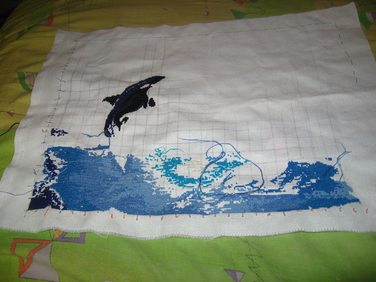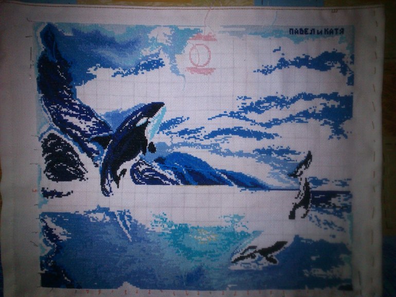 Потом окончание школы, учеба, свадьба.. Периодами когда лежала в больнице немного вышивала, там где море одним цветом большие участки.. Потом оно лежало, пока я не начала играть в игру Второе дыхание, и вот картина наконец-то "приобретает человеческий вид" Было: