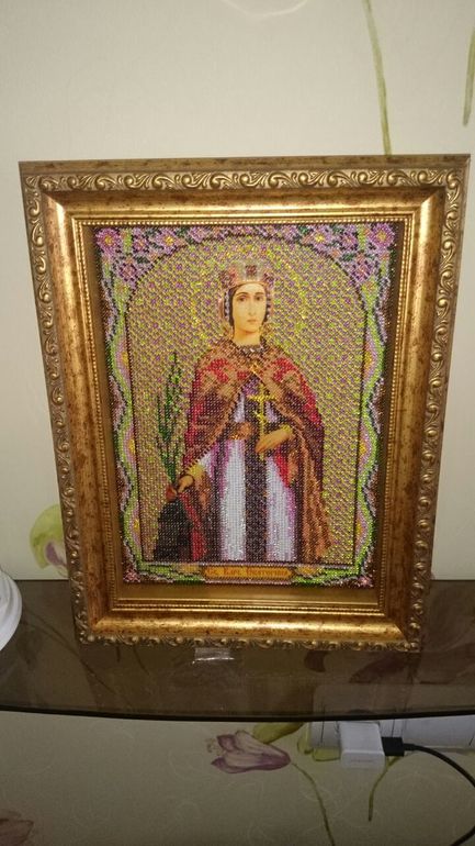 Далее я решила родственникам вышить иконы , и на этом с религиозной темой остановилась : святая Екатерина и Максим, вторую икону затянула , в багетной немного исправили перекос