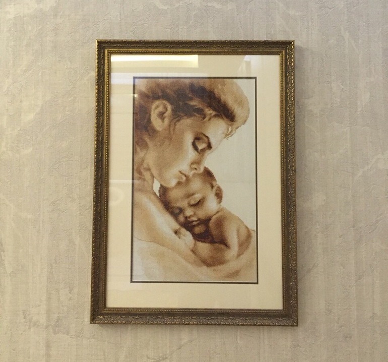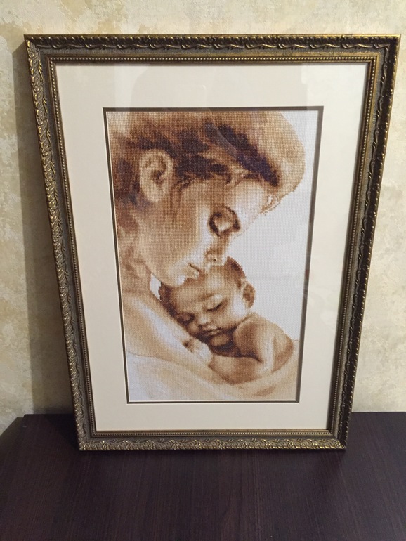 Этот набор мне подарили на день рождение ещё когда я была беременна , он долго лежал , а я не решалась начать , я доставала схему смотрела и понимала , что ещё чего-то мне не хватает ! Начала я его в мае , лето перерывшие были отпуска долгие , ездили к родителям , ездили на море , уже к концу когда вырисовывалась картинка моя скорость увеличилась ) вышила я её уже после дня рождения своего (ровно год прошёл получается как набор появился у меня ) , спустя три дня после дня рождения я могла отчитаться дарителям о проделанной работе. Для меня это моя первая большая вышивка , изнанка конечно оставляет желать лучшего , но я думаю со временем и я начну следить за изнанкой . Сейчас эта картина украшает нашу спальню )