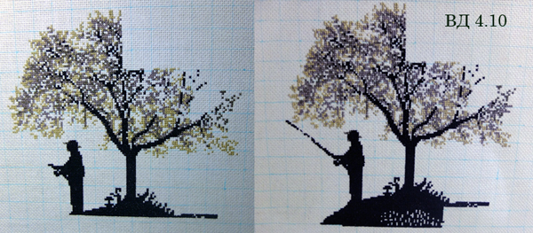Итак, обещанное. Мои таинственный шпиен с пистолетом устал ждать врага и решил мирно порыбачить. Пока удочка у него не ахти, да и леска недовышита, нов се впереди)))) Прибавился кусок суши, и поковыряла правые ветки, хоть этого и почти не видно. Когда устаю от черно-синего, перехожу на яркую и сочную серую листву, оттягивает))) Именно поэтому дерево до конца и не дошито)))