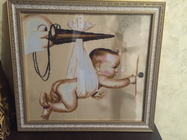 Работа заняла 1 месяц 2 недели , вышивалась в подарок , по окончании я всплакнула , понесла сама в багетную (обычно это делал муж) , сдала , сказали сделают проклейку, что должно получится хорошо , но всю неделю пока я ждала когда позвонят я переживала получится нет . Дошло до того , что мне приснился сон, что позвонили с багетной и сказали что работа лопнула когда они её натягивали :)