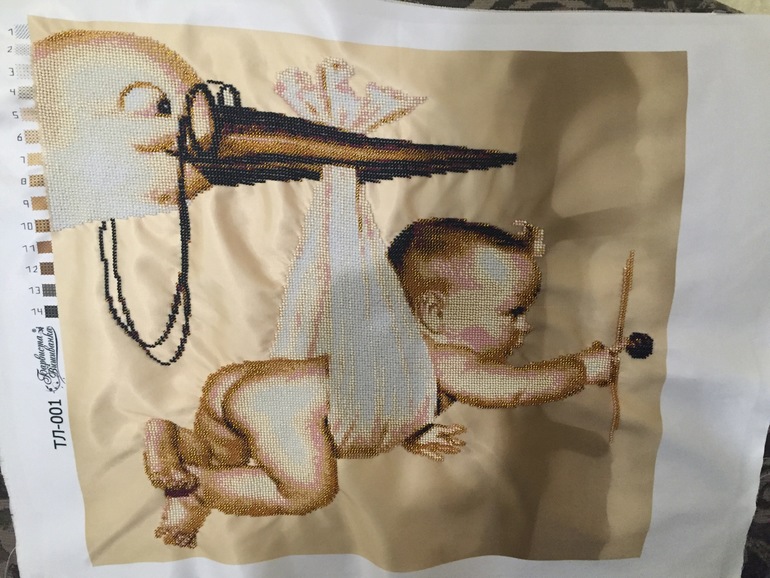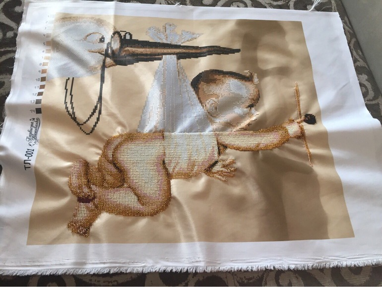 Большая работа , с пяльцами-рамкой я не дружу , поэтому вышивала так. На половине работы я поняла что много где появились стяжки , перетянула её всю , но решила довышивать распускать жалко (тем более знакомая уверила что в багетной все это смогут исправить , так это выглядело в половину работы: