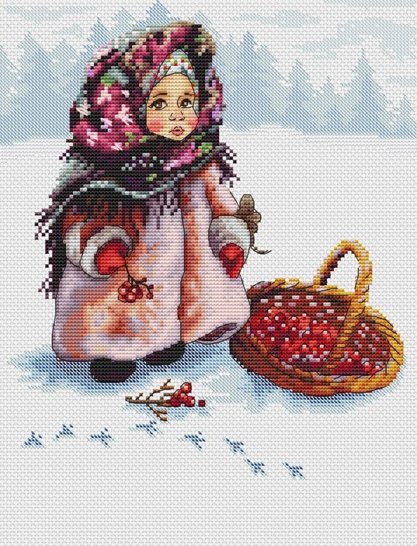 Размер 20 на 20. Тоже буду самостоятельно подбирать нитки) Прелестная девчушка, правда? Только я бы сделала ее улыбчивой и на снегу, возле следов, добавила бы пару птичек-снегирей. Думаю, так было бы веселее)