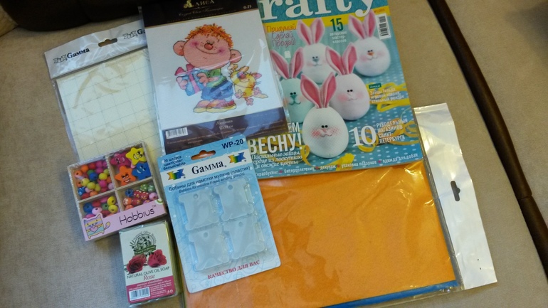Ну и собственно мои подарочки. Канва, бобинки, набор фетра, набор для вышивки, журнал и мыло. Пуговки-бусинки чуть не забыла )))