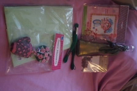 Вышивка с очаровательной нюшей,ниточки, пуговки, канва обалденного зеленого цвета, магнитик ,и пена для ванны в обалденной упаковке)
