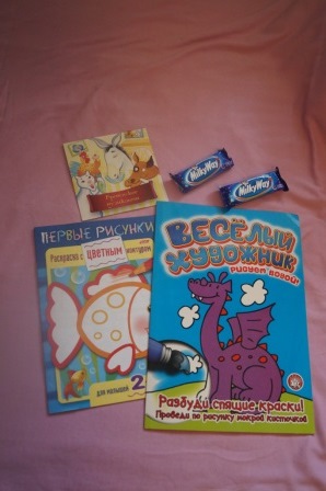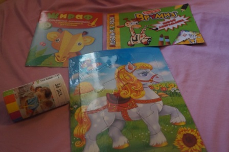 Это подарки для сыночка Илюшки-его любимые жирафы и лошадка и обалденные восковые мелки)