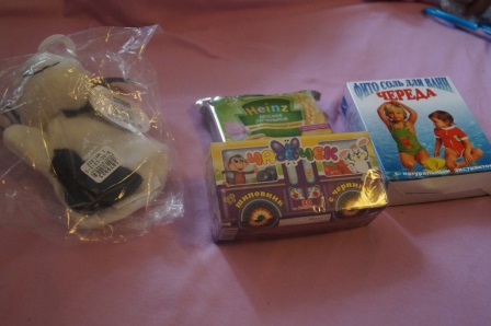 Чаек, его любимые печеньки, фитосоль для ванны и игрушка -коровка на руку-он от нее в полном восторге!