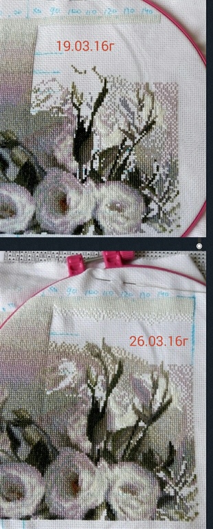 Привет! У меня опять муж заболел, это какой-то кошмар, 2 дня поработал, сегодня с ухом лежит( А насчёт вышивки думаю она у меня в долгострой перейдёт! Как то не с большим удовольствием я её вышиваю, одни розовые пятна( Ну и вот моё было и стало!