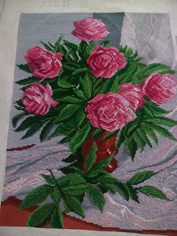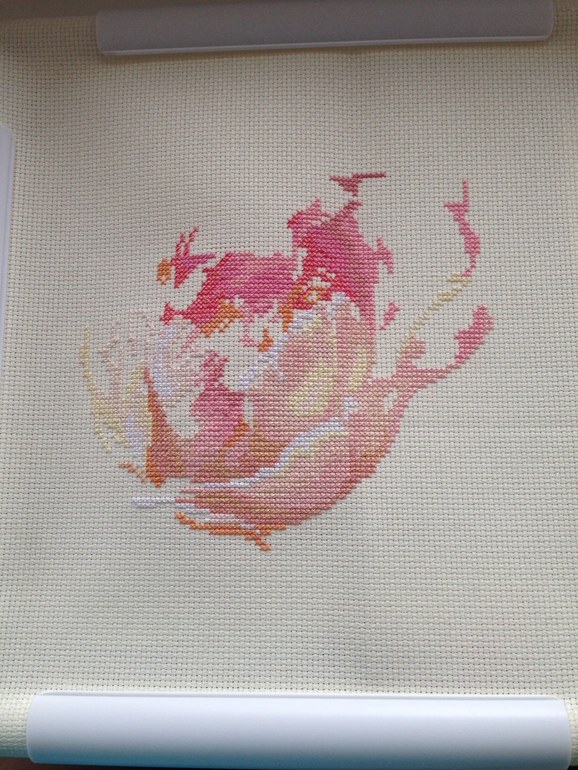 Движется то да, а вот морального удовлетворения не получаю!Обычно вышиваю и с нетерпением жду, когда новая часть рисунка вырисовывается! А здесь разные пятна розовых оттенков!(