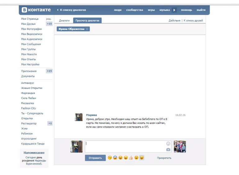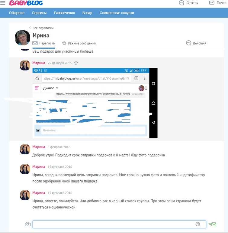 Так как это был первый организованный мною обмен подарками (а я человек все-таки ответственный), я начала искать Ирину по всем соцсетям и нашла ее в ВК. Там Ирина также попросту "динамила". Свой подарок по ОП Ирина получила и даже не удосужилась отблагодарить отправителя. В общем скрин переписки прилагаю