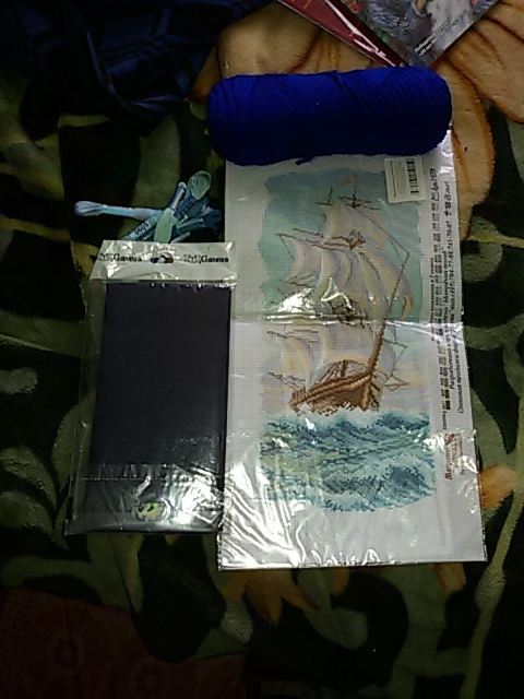 И это еще не все. Моток пряжи невероятно красивого цвета, мулине и парусник, который я давно хотела вышить. И еще - темно синяя канва!!! Хомяк просто от счастья чуть сознанье не потерял!