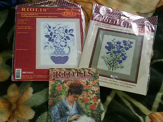 А дальше мой хомяк просто завизжал от счастья!! Наборы!! Настоящие!! Я наконец то увидела и взяла в руки настоящие вышивальные наборы. У нас их нет от слова вообще. А теперь у меня есть! Безумно красивые колокольчики, на льняной канве и шерстью.. Первый раз увидела, как выглядит шерсть для аышивания. А второй набор- мулине, ленты и бисер.. Ох, руки чешутся!! И очень яркий каталог Риолис