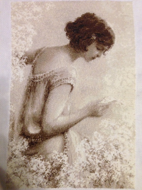 Даже и не помню, когда я начала вышивать эту девушку. Вышивала на руках, без пялец в обеденный перерыв. Это мой первый и последний опыт вышивки шерстяными нитками. Не понравились они мне, путались постоянно и крестики кривые. Вышила давно и лежала работа без бэка года 4 наверно. Нашла эту работу посмотрела вблизи кошмар, кривые крестики, разная степень натяжения креста, но решила все таки доделать! Ну и доделала заодно Бэк на Сладком сне от РТО,эта работа лежала очень долго-8 лет без бека!