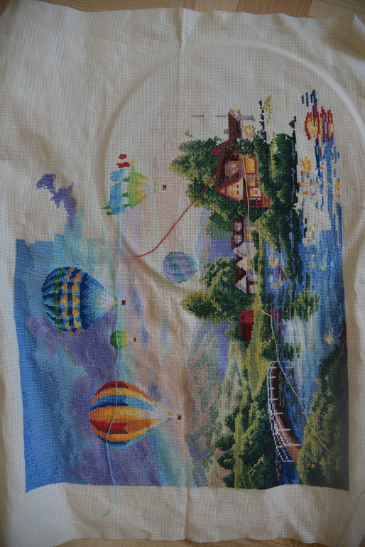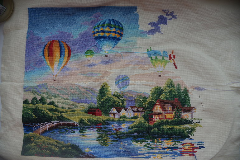 Небо не нравится. Вот тот значок круг разделённый на 4 части. Там одна яркая голубая нить, три синяя.на воде норм еще.а на небе вообще темно получается. У тебя прям светло-голубенькая на фото. И еще один цвет, красивый, яркий, мята, но на картине прям ядрено-зеленый выходит. Не могу прям в руки взять теперь((
