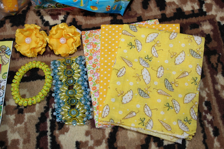 Книжечка с рецептами и краски как раз то что надо.Я краски не покупала, а тут вот уже есть))) Тканюшки просто суперские. Резиночки просто обалденные, Малая такая смешная в них))).Еще раз спасибо феечке за такую красоту!!