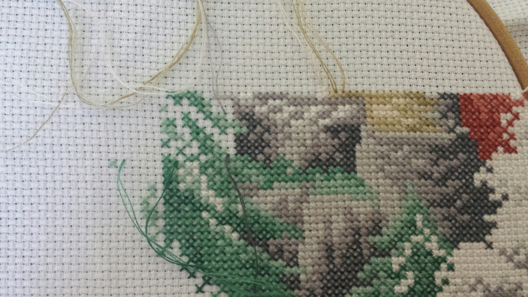Рисунок сложный, два очень близких цвета - темно белый (он же свееееееееееееетло серый) и просто белый. Я сначала вообще их не различала. Так что пришлось сначала все остальные цвета вышить и убедиться, что ниток и цветов достаточно :). теперь вот вышиваю и ругаюсь - еле различаю на канве на рисунке - где и какой цвет