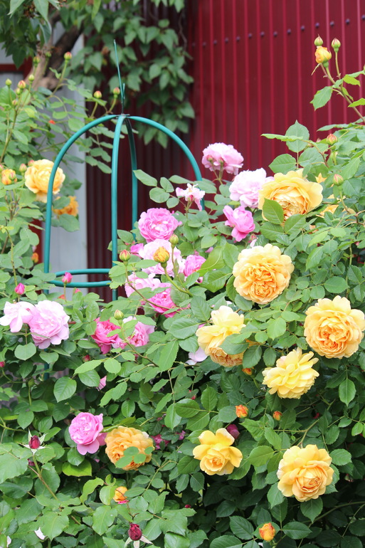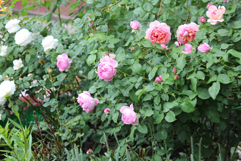 . Показывать пока особенно нечего)). Несмотря на то, что бутоны рано появились на розах, зацветают они все-равно только сейчас. Там цветочек, там два, а в остальном еще бутоны. Расцвели пока преимущественно розовые и желтые розы. Запах нереальный! У меня в основном остинки, они очень ароматные. На фото взрослые розы, им года по три-четыре. Сил много, поэтому раньше зацвели. Осенью посадила 16 штук новых. Они еще только-только начинают бутоны открывать. Пока жиденько)). И погода не для фотографий у нас сейчас. Вот немножко еще: