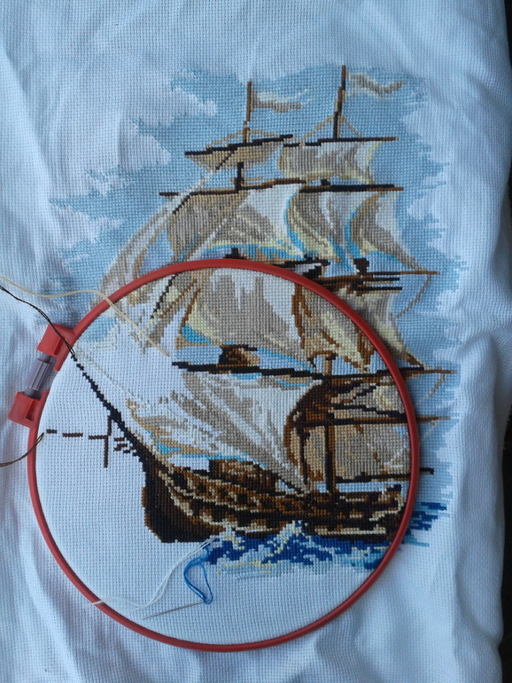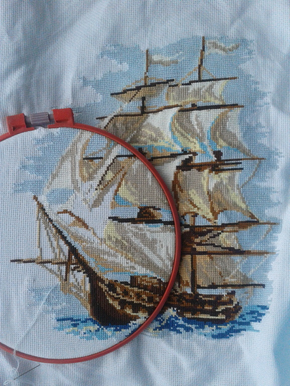 Всем привет! Мой кораблик почти готов, ещё чуть-чуть и поплывет. выходные выдались очень насыщенные. У нас 10 минут ходьбы от дома растёт леспосадка, ходили туда с классом на пикник, отдыхать. А в воскресенье ездили в гости к родственникам, поэтому времени повышивать очень мало. Ну и отчёт, это до: