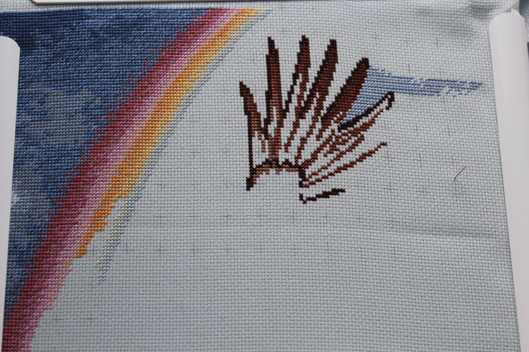 . Начала с полукреста (небо и радуга). Шло быстро, но захотелось на крестики перейти. Перешла на крыло - утомили скучные коричневые оттенки. Перешла снова на небо)). Думала вчера дошить более приличный кусок серым, но вечером гости нагрянули, не до вышивки было.