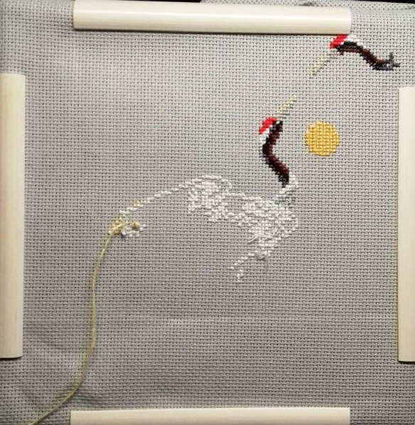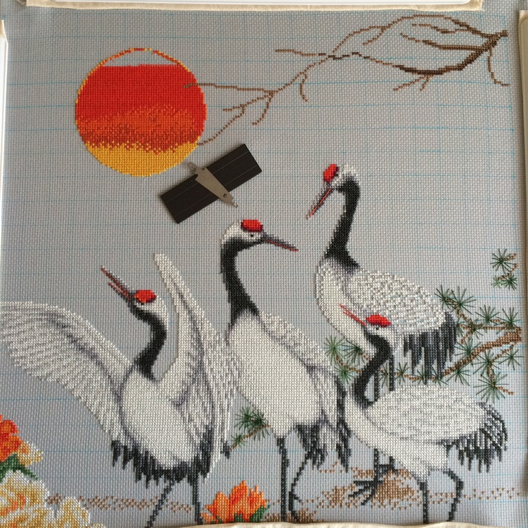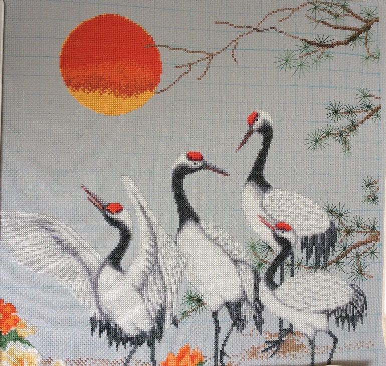 Чуть-чуть совсем осталось - листочки на верхней ветке, снизу зелень ещё, а то нитки кончились, пришлось докупать и иероглифы.