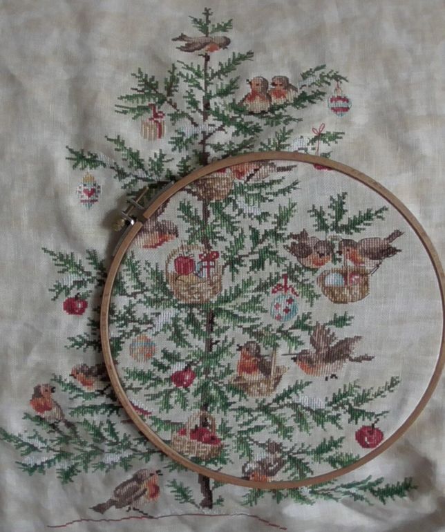 Всем привет! Елочка моя преображается, но уж больно медленно. Детишки и дела домашние занимают все время :( Вышита на сегодня 1/3 бэка. Сори за качество. Летом умудрилась сломать фотоаппарат и приходится фотографировать на видеокамеру.