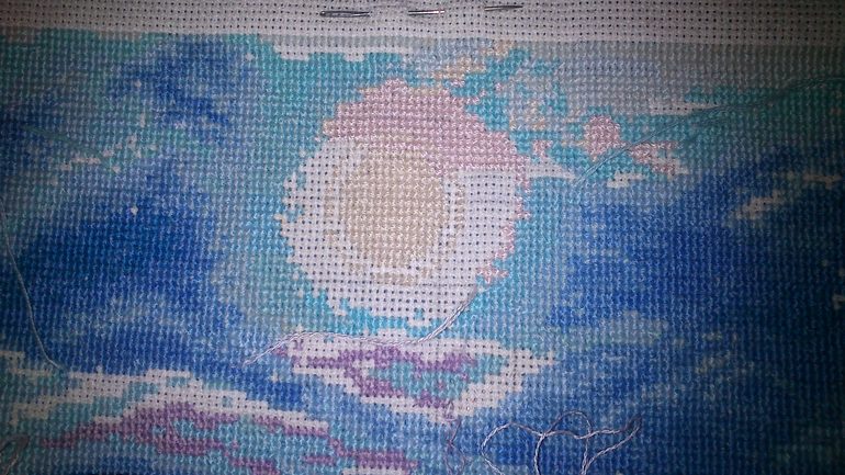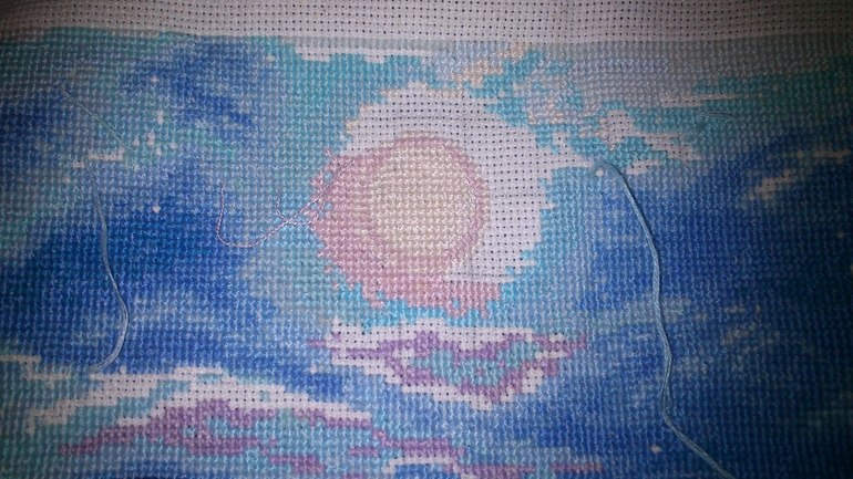 Уже вышила "солнышко" Луну, начала перешивать фиолетовый, но он наоборот стал ярче, вот сижу теперь и думаю... оставить этот цвет или перешить?
