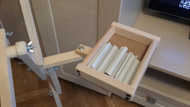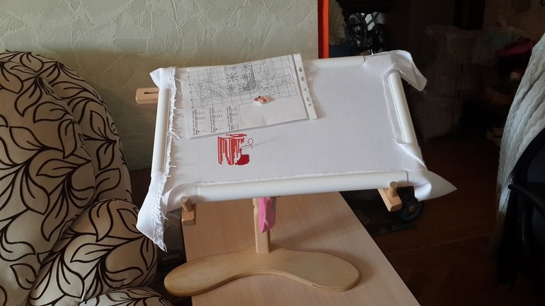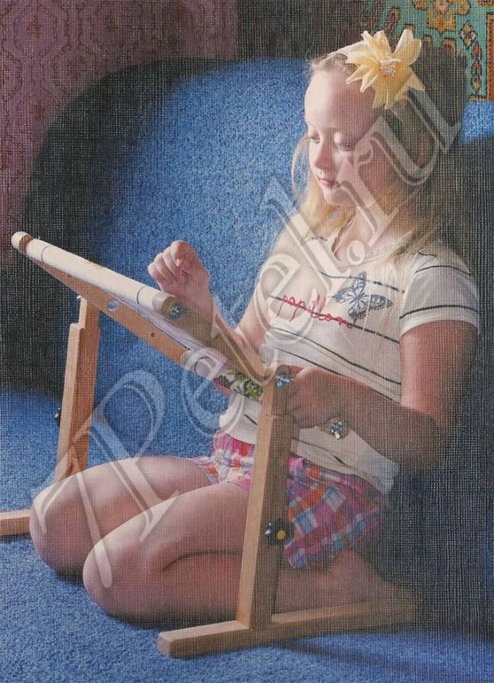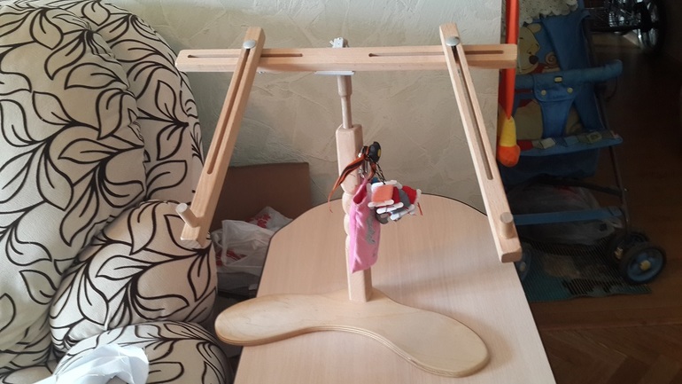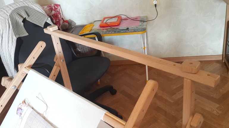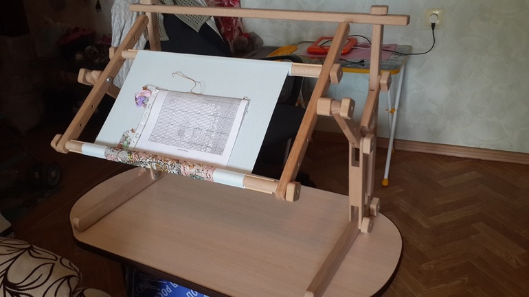 Достоинства: легкий, занимает в доме мало места, можно поставить на маленькую полочку и никто не достанет. Для меня основным достоинством было то, что рамку с вышивкой можно крутить в разные стороны как тебе удобно ( что не доступно, к сожалению, у обычного станка).