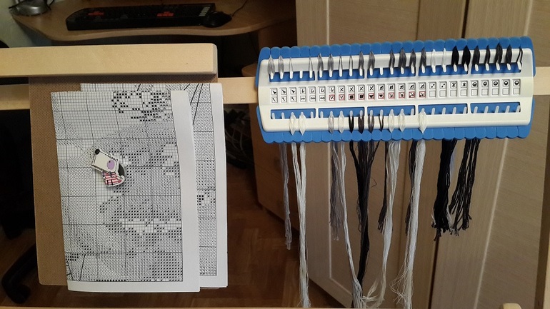 Достоинства: он стационарен (для меня немаловажно, т.к. с другими станками нужно раскладываться, искать себе место на диване. тут просто сел, когда появилась свободная минутка, поковырял немного и побежал, если что-то надо сделать, а для меня с тремя детьми это немаловажно, т.к. пока сядешь, пока разложишься, кто-то заплакал, нужно вставать, все убирать), есть держатель для схемы ( очень удобно держать схему под глазами, я всегда схему прицепляла к самой вышивке и если полотно маленькое, то приходится постоянно ее двигать), легкий (но тут уж наверное от материала зависит, из которого сделан станок), есть дополнительная планка, к которой я удачно прикрепила органайзер ПАКО