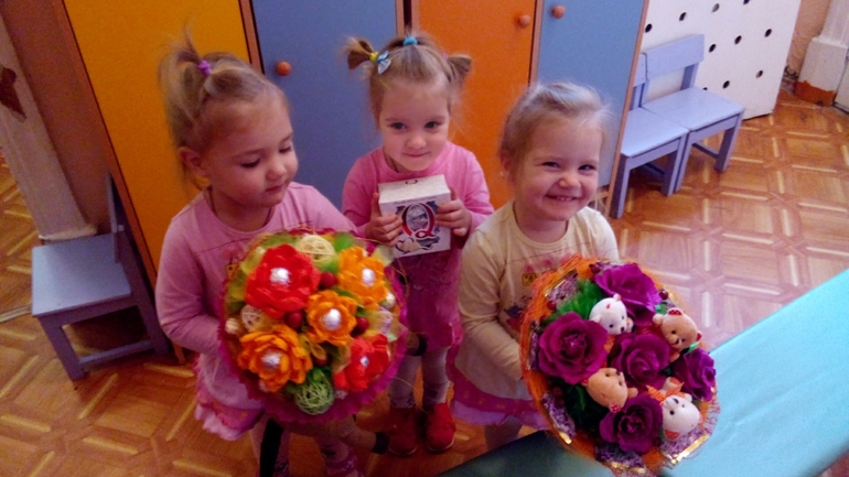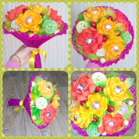 Теперь хочу очень похвастаться своими творениями. В сад букеты из конфет делала и дочке в школу бант.