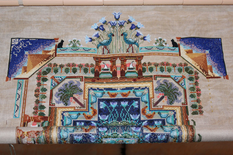 Закрутила плотненько барашки, не стала их снова раскручивать. Помимо видимого поля (небо над левой пирамидой и половина левой стороны) вышиты еще левые колонны с парусниками. Пока все).