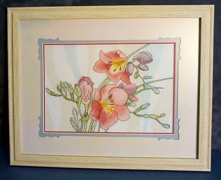 Вышивка крестом ГОТОВЫЕ РАБОТЫВышивала черепашьими темпами свекрови в подарок на ДР, неоформленные были на стенде Картеля Дизайнеров на осенней Формуле рукоделия, "одевались" аж в Тюмени в багетке Надежды Шишкиной, и сразу из Тюмени отправились к имениннице в Воронеж, в общем, не фрезии, а путешественницы))). Это был сюрприз, свекровь после получения позвонила и целый час рассказывала, в каком она восторге, а свекр сказал, что бабка обезумела и бегает с рамой по дому, ищет, куда лучше повесить))). Я очень переживала, понравится ли, поэтому после такой реакции довольна, как слон