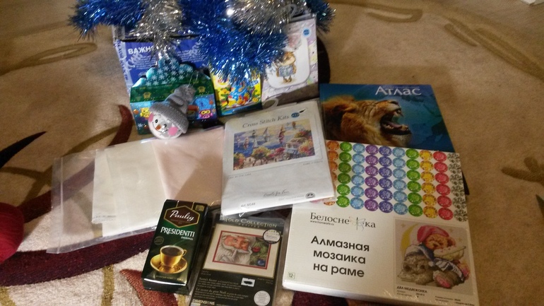 на Новый год. Когда, я открыла подарок, я потеряла дар речи от счастья) Катя, положила подарки из моих хотелок. Все такое красивое. Я даже не знаю, как все это передать словами) Я наверно час сидела около коробки и все перебирала))