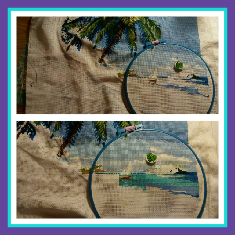 Палец мой потихоньку заживает, но еще конечно мучаюсь с ним. Вышивку немного поковыряла, насколько смогла, пока палец совсем не разнылся! Так что строго не судите((( Сама расстроена до жути!