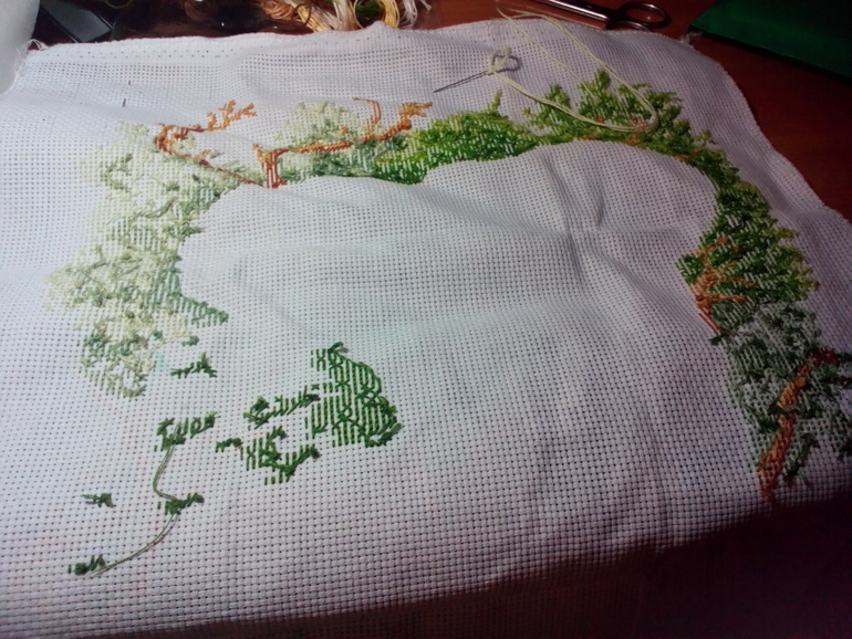 Всем привет! Я сейчас в любое свободное время сплю, поэтому темпы вышивки снизились. Сейчас закончила еще один лист, и теперь у моей вышивки есть душа.