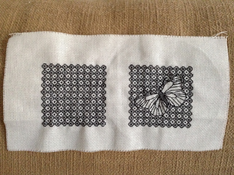 С обратной стороны лучше видно сколько вышито, не сливается с цветной схемой:-)
