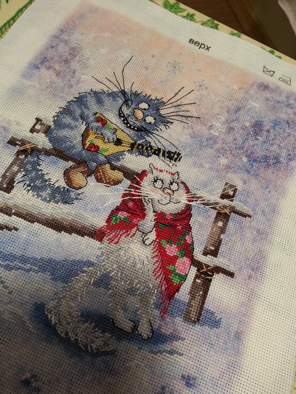 Канва Аида 18. Нитки Гамма( ужасное качество! ) Во время работы скручивались, завязывались в узелки, и даже несколько раз рвались. Нарезаны коротко(для меня это минус) Из плюсов - отличная хорошо читаемая схема и забавная картинка.
