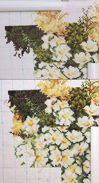 Всем привет! Неделя выдалась совсем не вышивальной, маки даже ни на крестик не выросли. Зато подрости на 500 крестиков ромашки, таскала их с собой на дачу на выходные (ура, они компактные!). Из техники вне кухни - станок вышивальный))) А чем не техника, народ постоянно спрашивает, что это за орудие пыток, если на нем работа не висит))) Было/стало: Сорри за фото, снова с телефона.. Всем хорошей недельки!!