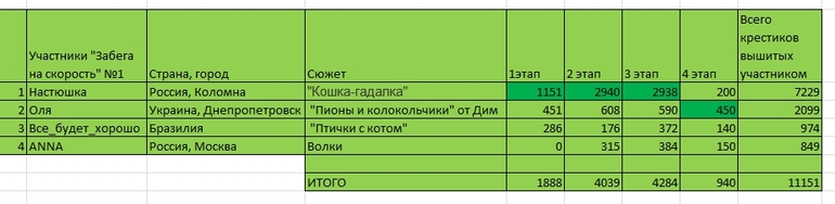 По итогам суммы вышитых крестиков лидирует Настюшка с"Кошкой-гадалкой".Но лидер дня сменился. Лидером вышитых крестиков за 4 отчетный день стала Оля с "Пионами и колокольчиками" от Дим.