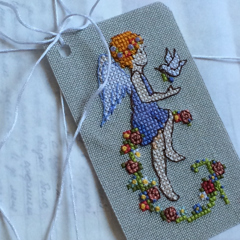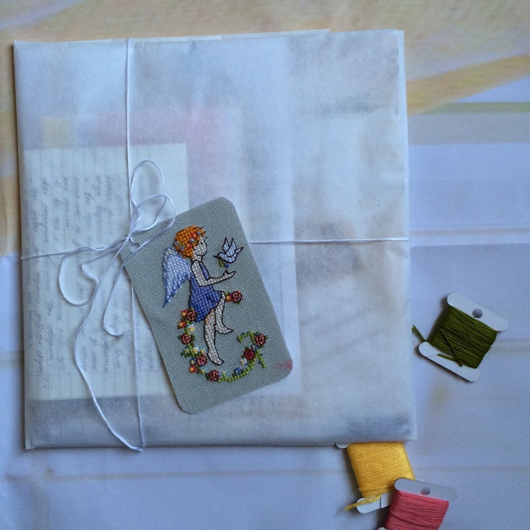 Про Бритни - сама по себе тканька понравилась, но какой-то размер не мой (это 27 чтоли...или 28 каунт). В три нитки мне не удобно на ней, в две некоторые марки жидковато выглядят. А я тут все испробовала что имела - ДМС, Киров, Гамма, неопознанный Китай и даже единственный моточек Мадейры:) Сначала хотела для пущего эффекту вместо узелков биссер нашить - но на венке начала, и убедилась, что мой бисер крупный слишком. Вот такой тест драйв случился, а чтоб не скучно было, я вышивала букву G из цветочно-ангельского алфавита, по первой букве имени получательницы. Уже все упаковала, завтра отправлю в путь