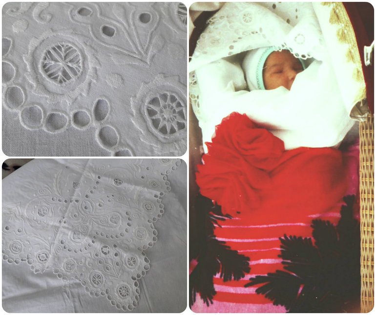 На днях на даче разбирала коробки и нашла вот такую свою вышивку.Вышивала в роддом дочьке(тогда ещё забирали в одеялках с уголками).Вышивка ручная-ришелье