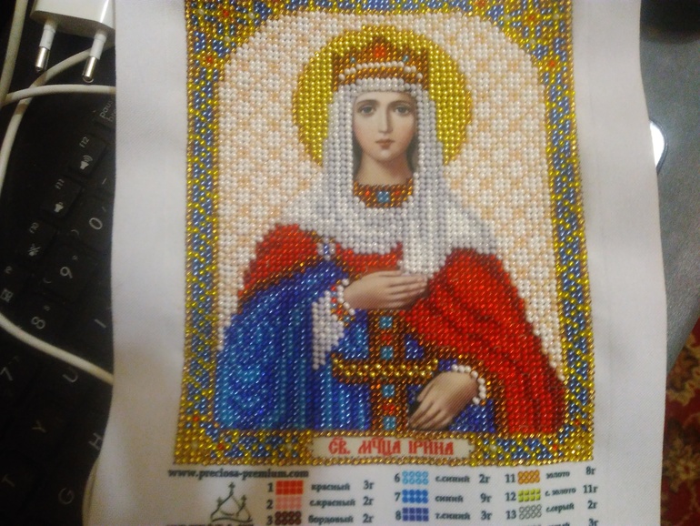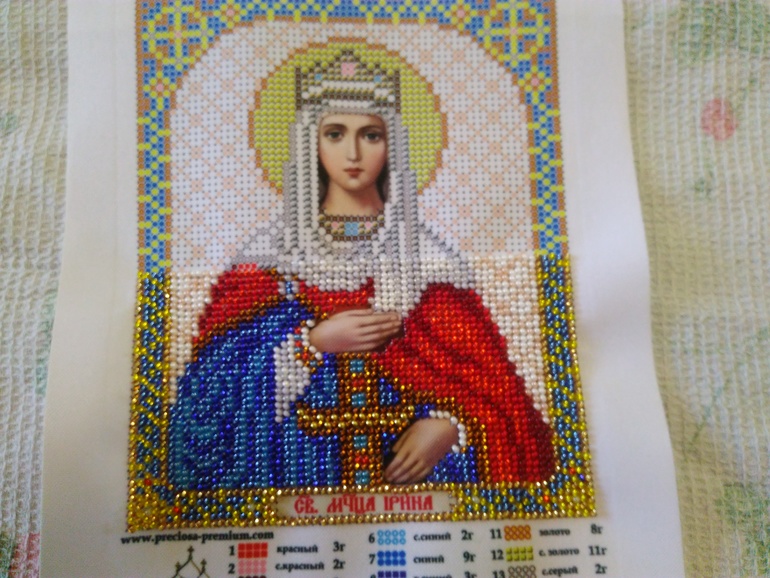 У меня казус случился, я к этой вышивке заказала рамку, она идёт специально к этой вышивке. Так вот, она оказалась чуть великовата, видна белая окантовка за бисером. Так что заказала новую рамочек, она будет готова через 18 дней. Так что я в огромном пролете, но крестница будет ждать;)