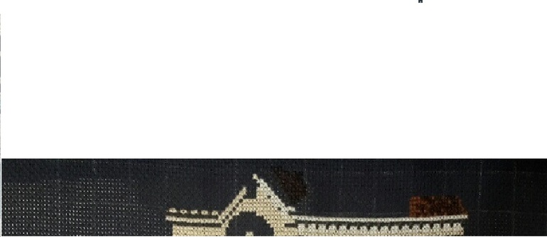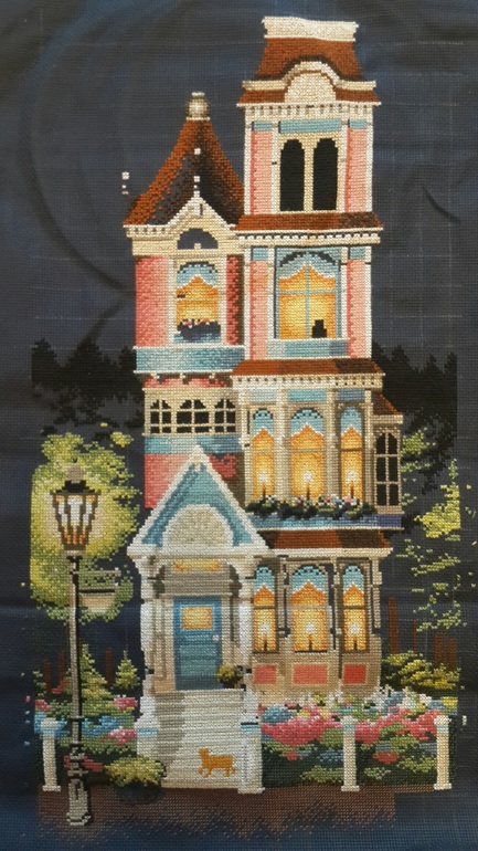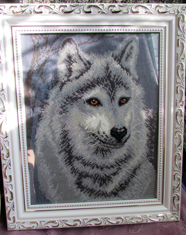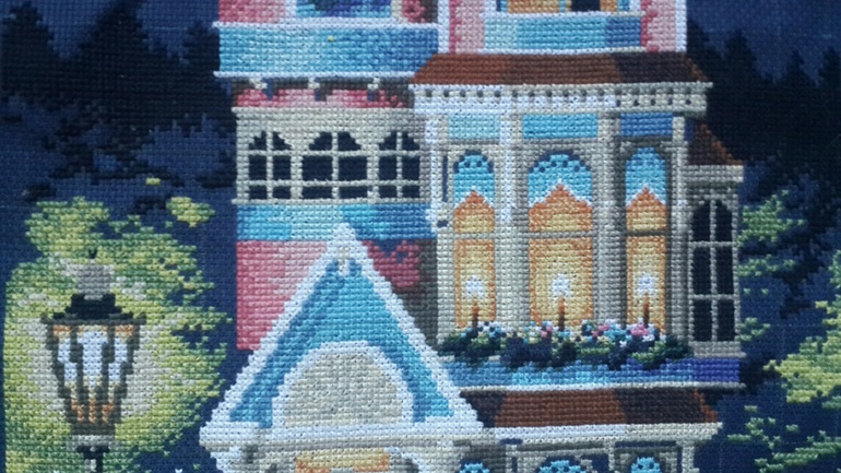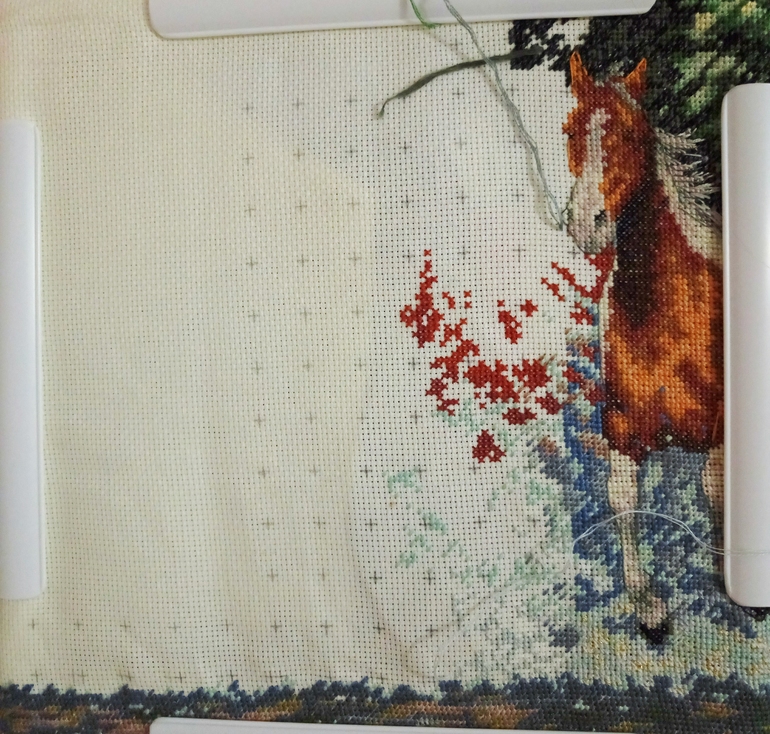 вообще, ещё очень много не вышито внизу. И то тут, то там в середине, небо. Так что работы ещё много. А вот в полный рост (извините за помятость).