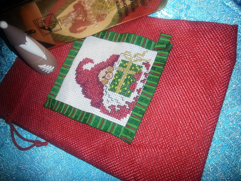 Из новогодней тематики ещё вышила на подарочный мешочек гнома