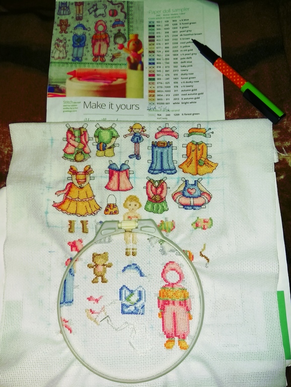 Так-с, далее. Не могу найти ни одной, ни второй вышивки на прошлом этапе. Но, как видите, вернулась к бумажной кукле и деткам. В кукле порола нить бэка, которую ранее вышила другим цветом, кто помнит. В детках вышила низ (там покрывало, на котором стоит девочка)