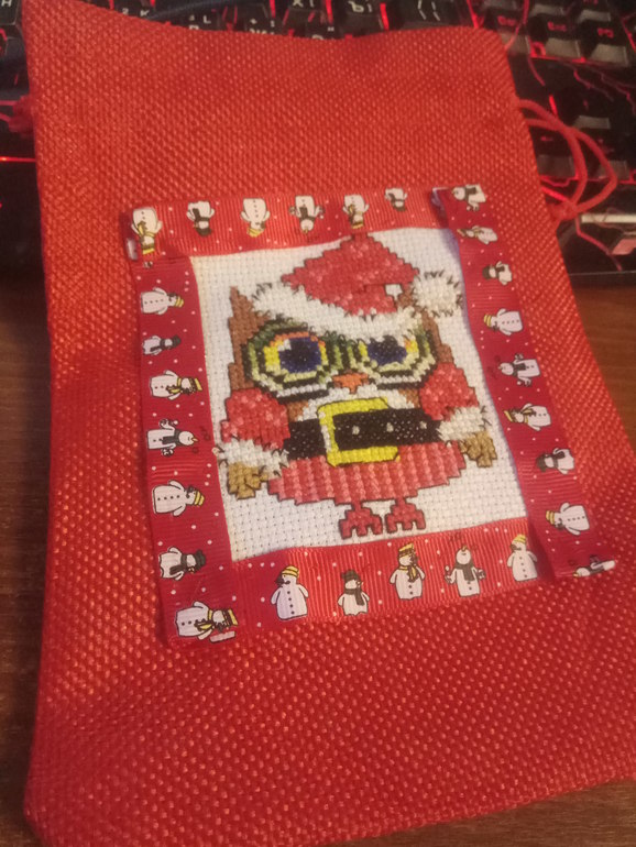 Вышилось у меня две совушки, оформила их в подарочные мешочки.
