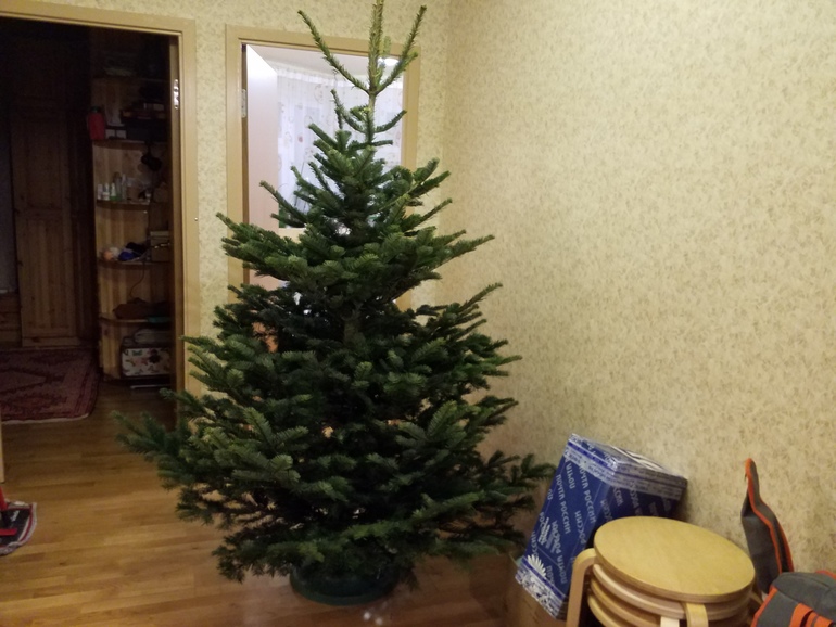 Купили елку, а точнее пихту, нарядили) Сын постоянно на нижнем уровне игрушки перевешивает )