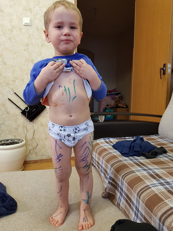 Опять же сын в выходные спрятался в комноте снял одежду и разрисовал себя, потом обратно оделся и всю эту красоту я увидела когда я его пошла мыть, даже пятки разрисовал.