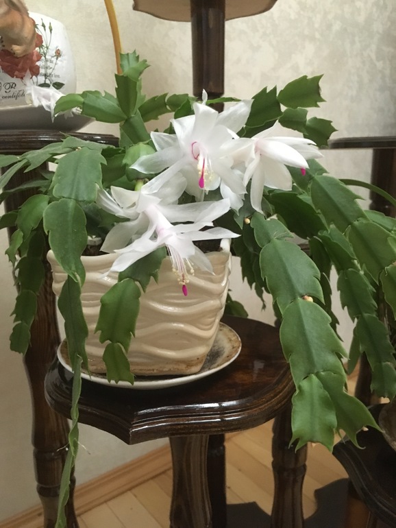 У меня у мамы тоже цветет сейчас декабрист, только розового цвета...отлично повышивала, челкунчика совсем немного осталосьдовышивать...